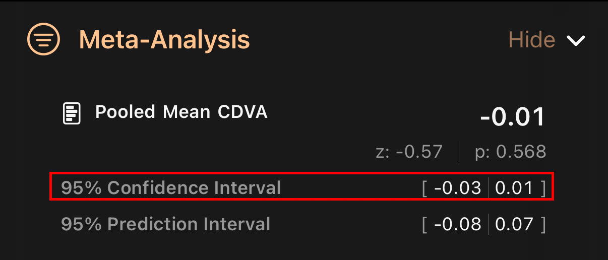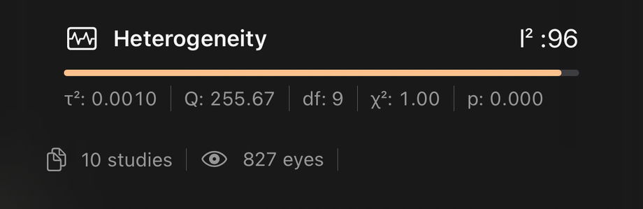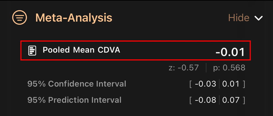 IOLEvidence can compute either the pooled mean or rate depending on the characteristics of the outcomes (continuous values, such as logMAR for visual acuity) or percentages (for percentage of patients achieving a particular level of visual acuity or patient reported outcomes such as Spectacle Independence, Dysphotopsia, and others).