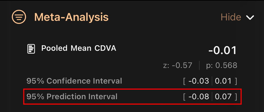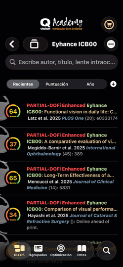 This screen summarizes the published scientific evidence for the selected Intraocular Lens or Functional Vision category for the outcome of interest allowing to access to the pooled mean of studies before a peer review Meta-Analysis is published.