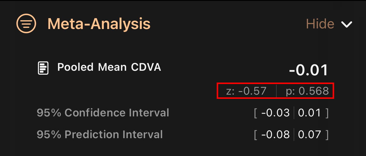 The z statistic expresses how far the pooled mean is from the reference value (usually 0 for continuous outcomes such as logMAR), measured in standard errors. Values close to zero indicate that the pooled mean is very close to the reference.
