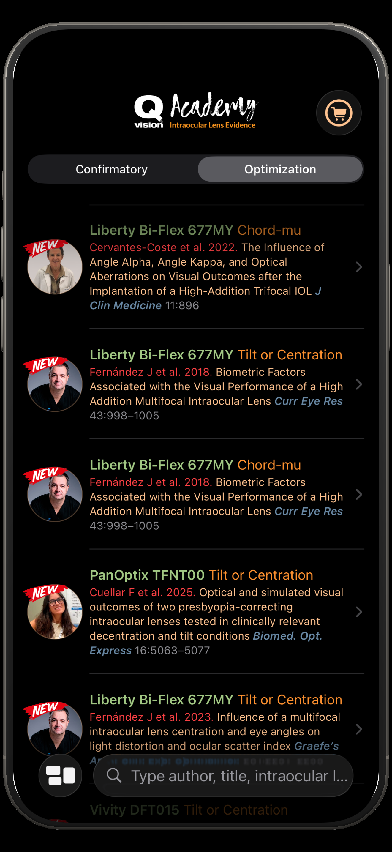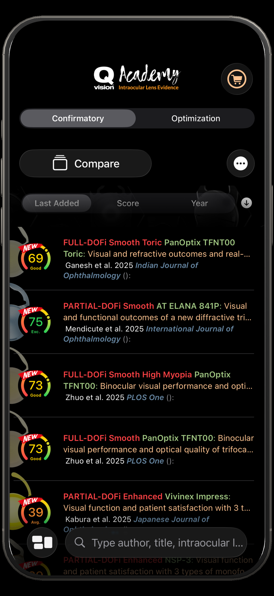 One of the simplest and most practical ways to start using IOLEvidence is to stay continuously updated with the latest scientific evidence. The app is periodically updated with newly published studies. Newly added reports are clearly identified and can be accessed directly from the Search section. The Search section is accessed by tapping the magnifying glass icon in the bottom navigation bar. By default, the list is ordered by Last Added, allowing users to immediately view the most recent reports included in the application and quickly identify new scientific publications.