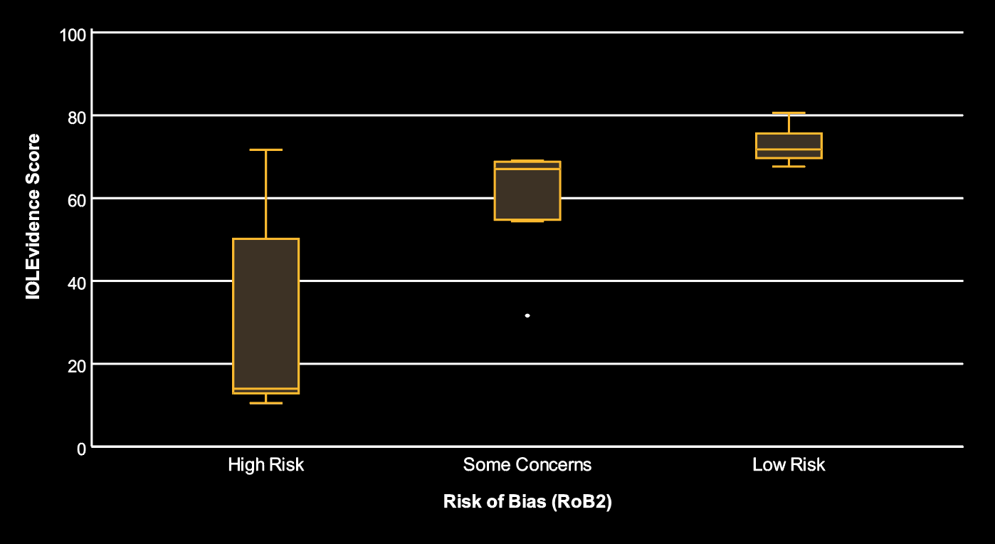 Interpretation: the two approaches broadly agree in direction. When RoB 2 suggests fewer methodological concerns, IOLEvidence Score often indicates stronger reliability signals. When RoB 2 suggests more concerns, IOLEvidence Score often decreases. This supports the idea that IOLEvidence captures information related to study robustness.