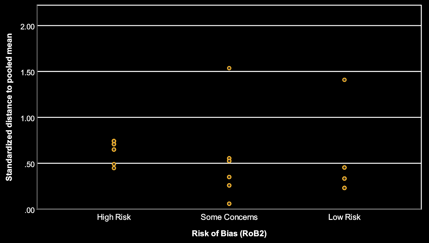 Interpretation: this does not contradict RoB 2. RoB 2 is not designed to predict how close a study must be to the pooled estimate. A well-conducted study can legitimately differ from the pooled mean (because populations or procedures differ), and a high-risk study can still land near the pooled mean (because bias may be small, inconsistent, or coincidentally aligns with the average). Therefore, RoB 2 alone will often be only a modest separator of “how extreme” a study looks.