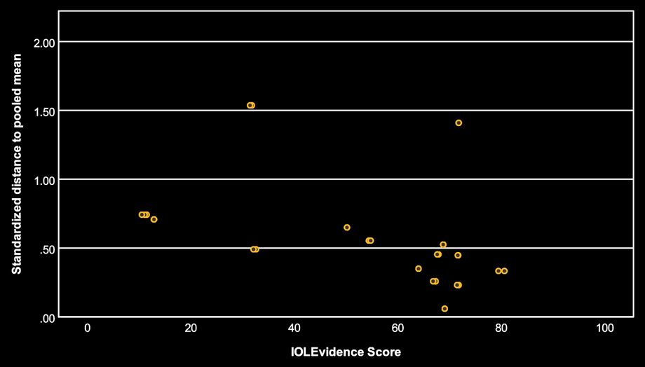 Interpretation: in this meta-analysis, studies with more reliability signals (higher IOLEvidence Score) tend to produce results that are less “outlying” relative to the pooled DCIVA estimate. Importantly, this does not mean that low-scoring studies are biased or wrong. It means that, here, lower scoring studies are more often the ones that produce more extreme results, which can happen for many reasons (heterogeneity, small samples, or systematic issues).